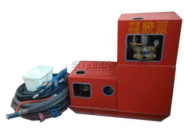 凝膠泵主泵用來輸送已加入促凝劑的水。輔泵用來輸送液態(tài)純膠(如水玻璃)。這兩種液料經(jīng)各自的輸送膠管輸送到混合器中均勻混合后,經(jīng)三個出液口送出。根據(jù)各料的配比不同,這種液態(tài)的高水膠料混合液可在30~400秒內(nèi)形成固態(tài)膠體,用于煤礦滅火和防火。